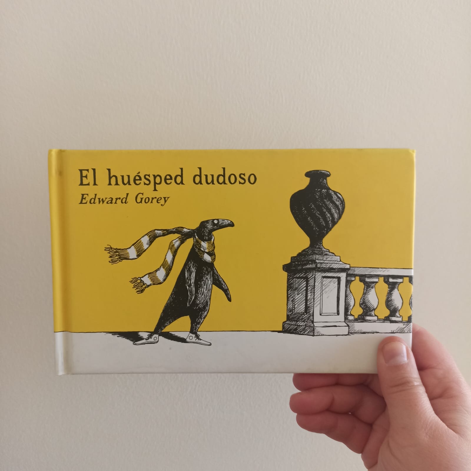 Un día, un ser llega a la casa y, sin previo aviso, entra. Veloz como bala no se detiene hasta que apoya la nariz en la pared de la sala. Pasan las jornadas sin dar señales de irse y sus actitudes son cada vez más extrañas: arranca las hojas de los libros sin piedad, descansa dentro de la sopera… Y así, pasan diecisiete años. Este libro álbum, con ilustraciones oscuras, en blanco y negro, con personajes estilizados y ambientado a principios del siglo XIX, explora el absurdo y el sinsentido, desde un humor refinado y sutil. Las ilustraciones permiten observar a este huésped, que ni siquiera es humano, remeciendo la cómoda vida de las personas. La historia es narrada con rimas, las que otorgan ritmo y fluidez a la narración. Es un libro ilustrado que desafía edades y que demuestra que no todo lo ilustrado es para un público infantil.